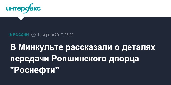 Москва. 14 апреля. INTERFAX.RU - Форма владения при передаче Ропшинского дворца "Роснефти" может быть определена в течение трех месяцев, сообщил "Интерфаксу" в пятницу замминистра культуры РФ Олег Рыжков.