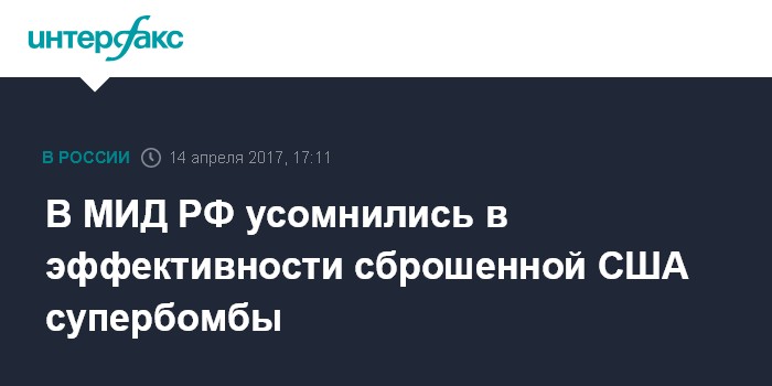 Москва. 14 апреля. INTERFAX.RU - В Москве хотели бы увидеть доказательства эффективности удара США с применением сверхмощной бомбы по позициям террористической организации "Исламское государство" (запрещена в РФ - ИФ) в Афганистане.
