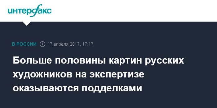 Москва. 17 апреля. INTERFAX.RU - Более 55% произведений искусства русских авторов при экспертизе оказываются поддельными, самыми популярными у фальсификаторов являются Иван Айвазовский, Иван Шишкин, Константин Коровин, Исаак Левитан, сообщили "Интерфаксу" в центре Научно-исследовательской независимой экспертизы (НИНЭ) имени Третьякова в понедельник.