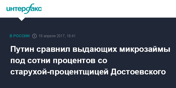 Москва. 18 апреля. INTERFAX.RU - Президент РФ Владимир Путин сравнил банкиров, предоставляющих гражданам потребительские кредиты под гигантские проценты, со старухой-процентщицей из романа Достоевского "Преступление и наказание".