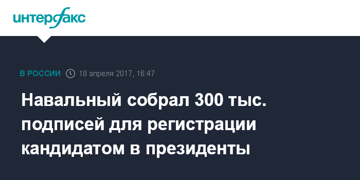 Москва. 18 апреля. INTERFAX.RU - Оппозиционный политик Алексей Навальный собрал 300 тысяч подписей, необходимых для регистрации кандидатуры на выборах президента РФ. Об этом сам Навальный сообщил на своем сайте.