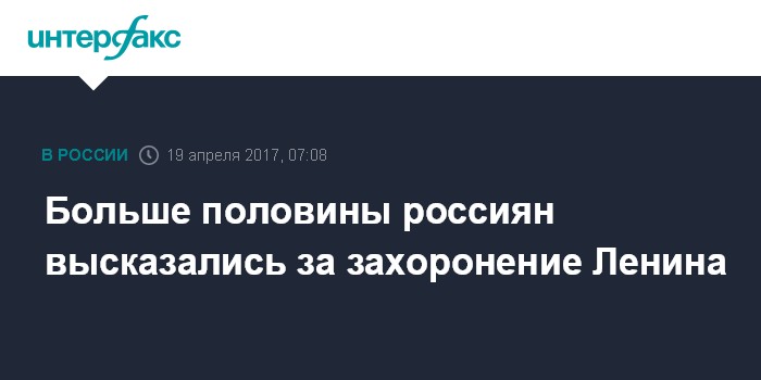 Москва. 19 апреля. INTERFAX.RU - Более половины россиян считают, что тело Владимира Ленина нужно захоронить: 32% предлагают сделать это у Кремлевской стены, а 26% - на Волковском кладбище в Санкт-Петербурге, сообщили "Интерфаксу" в среду в "Левада-Центре".
