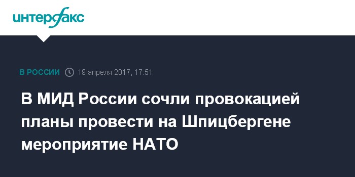 Москва. 19 апреля. INTERFAX.RU - В Москве считают провокационными планы провести на архипелаге Шпицберген мероприятие по линии Парламентской ассамблеи НАТО, его фокус на Арктике способствует нагнетанию напряженности, что лишь ослабляет безопасность стран Северной Европы, заявили в МИД РФ.