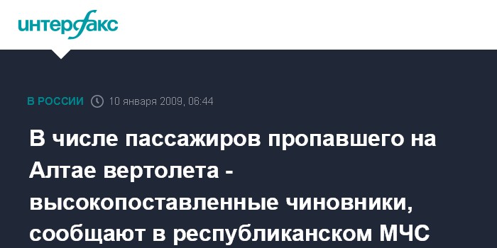 Горно-Алтайск/Красноярск. 10 января. ИНТЕРФАКС-СИБИРЬ – Среди пассажиров вертолета Ми-8, пропавшего в Республике Алтай, находятся члены республиканского правительства, сообщили в субботу агентству "Интерфакс-Сибирь" в республиканском управлении МЧС.