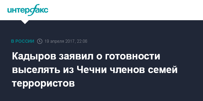 "Если у них сын или брат вышел, стал на путь терроризма, если семья им помогает, если семья сидит дома безработными, получают пенсии, пособия, прикрывая своего сына или брата помогая им финансово убивать нас, таких людей мы будем выселять",- сказал Кадыров в среду в интервью телеканалу Russia Today.