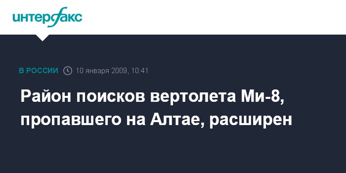 Барнаул. 10 января. INTERFAX.RU - Спасатели на вертолетах и самолетах расширили район поиска вертолета Ми-8, пропавшего в пятницу в горах Республики Алтай.