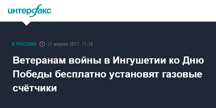 Москва. 21 апреля. INTERFAX.RU - Власти Ингушетии в преддверии Дня Победы проведут акцию по установке газовых счетчиков ветеранам Великой Отечественной войны, сообщили агентству "Интерфакс" в пресс-службе Народного Собрания республики.