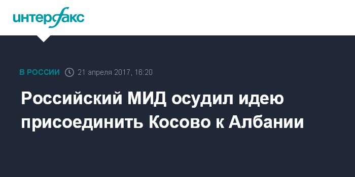 Москва. 21 апреля. INTERFAX.RU - МИД РФ осудил идею объединения в одном государстве Албании и односторонне провозгласившего независимость Косово.