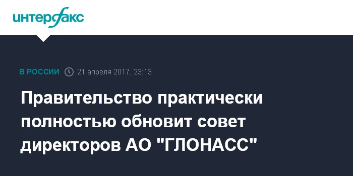 Москва. 21 апреля. INTERFAX.RU - Правительство РФ решило практически полностью обновить состав совета директоров АО "ГЛОНАСС", оператора системы экстренного реагирования при авариях на дорогах "ЭРА-ГЛОНАСС".