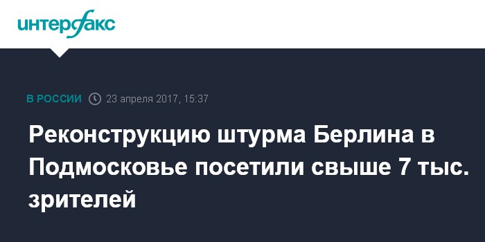 Москва. 23 апреля. INTERFAX.RU - Более семи тысяч зрителей, в том числе министр обороны России Сергей Шойгу, посетили военно-историческую реконструкцию "Штурм Берлина" в подмосковном парке "Патриот", сообщил представитель Минобороны России.