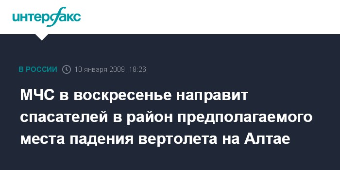 Москва. 10 января. INTERFAX.RU - МЧС РФ в воскресенье начнет проверку показаний одного из очевидцев предполагаемого крушения вертолета "Газпромавиа" о месте падения вертолета на Алтае.