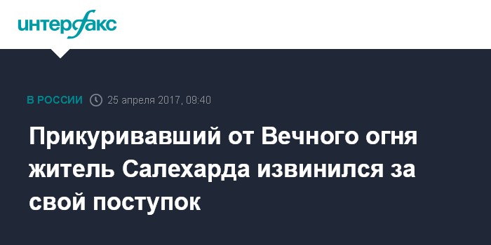 Москва. 25 апреля. INTERFAX.RU - Полицейские установили личность молодого человека, который пытался прикурить от Вечного огня в Салехарде и чей знакомый снял это процесс на фото и выложил в интернет.