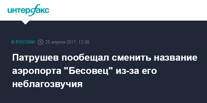 "Неоднократно поднимался вопрос о его переименовании. Думаю, мы, Артур Олегович (Парфенчиков, врио главы Карелии - ИФ), этот вопрос решим", - сказал Патрушев. Ровно год назад, 26 апреля 2016 года, министр внутренних дел Владимир Колокольцев предложил сменить название аэропорта "Бесовец" в Петрозаводске на другое, не вызывающее ассоциаций с потусторонними силами.