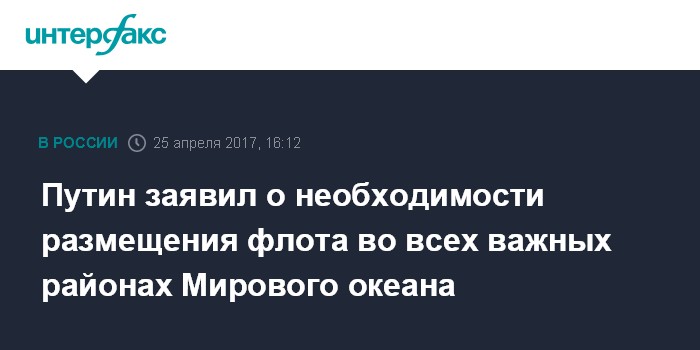 Москва. 25 апреля. INTERFAX.RU - Россия намерена разместить флот во всех стратегически важных районах Мирового океана и укрепить морские стратегические ядерные силы, заявил президент РФ Владимир Путин.