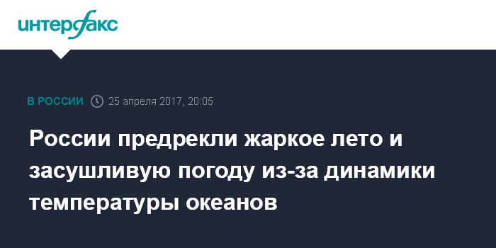 Москва. 25 апреля. INTERFAX.RU - Эксперты Commodity Weather Group прогнозируют жаркое лето и засушливую погоду для России и Украины, отмечая, что неблагоприятные условия могут снизить урожаи кукурузы и подсолнечника. Причина тому, по их мнению, - динамика температуры океанов.