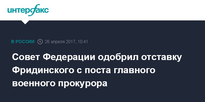 Москва. 26 апреля. INTERFAX.RU - Совет Федерации на заседании в среду освободил Сергея Фридинского от должности главного военного прокурора РФ в связи с его прошением об отставке.