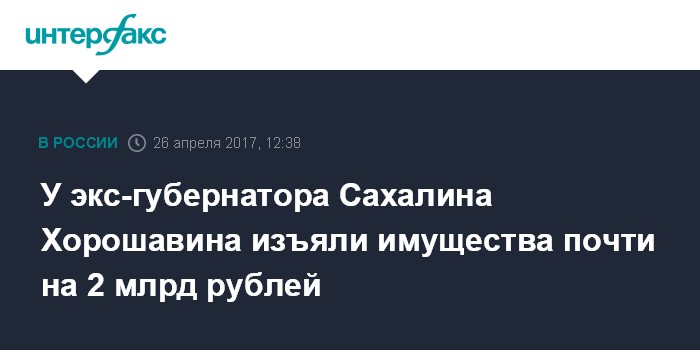 Москва. 26 апреля. INTERFAX.RU - У бывшего сахалинского губернатора Александра Хорошавина изъято незаконного приобретенного имущества почти на 2 млрд рублей, сообщил генпрокурор РФ Юрий Чайка.