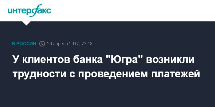 Москва. 26 апреля. INTERFAX.RU - Клиенты банка "Югра" второй день испытывают трудности с проведением платежей, кредитная организация обещает восстановить работу в нормальном режиме в четверг, 27 апреля.