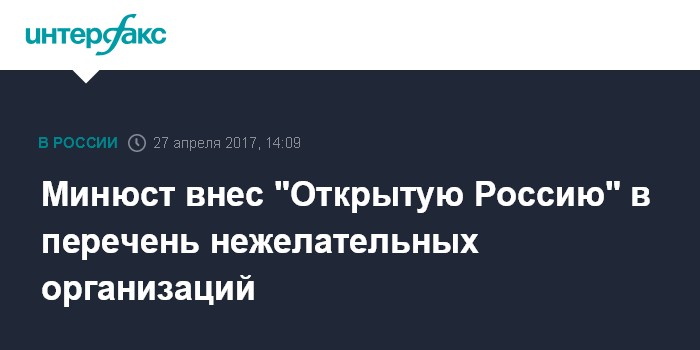 Москва. 27 апреля. INTERFAX.RU - Минюст России в четверг включил в ведомственный перечень три признанные нежелательными в РФ иностранные неправительственные организации (НПО), в том числе основанное бизнесменом и экс-главой ЮКОСа Михаилом Ходорковским движение "Открытая Россия".