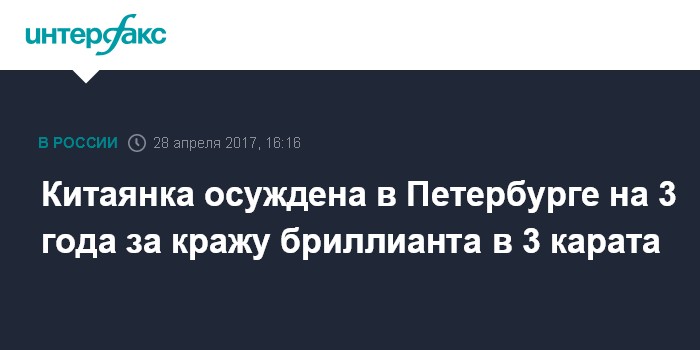 Москва. 28 апреля. INTERFAX.RU - Пушкинский районный суд Петербурга приговорил к трем годам колонии гражданку Китая за кражу бриллианта с выставочного стенда, сообщила пресс-служба Санкт-Петербургского городского суда в пятницу.