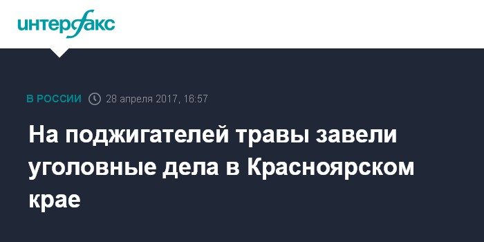 Москва. 28 апреля. INTERFAX.RU - Уголовные дела возбуждены на поджигателей травы, виновных в возникновении пожаров в нескольких населенных пунктах Красноярского края, сообщает пресс-служба Главного управления МВД России по региону в пятницу.