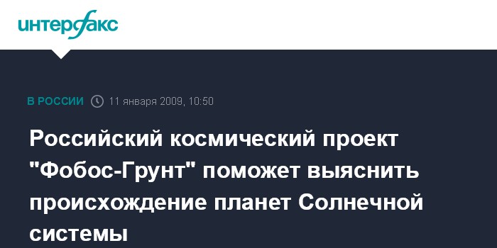 Москва. 11 января. INTERFAX.RU - Запланированный на 2009 год полет российского космического аппарата "Фобос-Грунт" к спутнику Марса Фобосу позволит ученым вплотную приблизиться к ответу на вопрос о зарождении планет Солнечной системы, в том числе Земли, считает ученый секретарь Института космических исследований (ИКИ) РАН Александр Захаров.