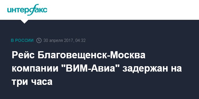 Москва. 30 апреля. INTERFAX.RU - Вылет самолета авиакомпании "ВИМ - Авиа" из Благовещенска в Домодедово отложен более чем на три часа из-за задержки самолета из другого рейса.