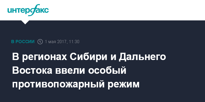 Москва. 1 мая. INTERFAX.RU - Особый противопожарный режим, устанавливающий запрет на сжигание травы, мусора, порубочных остатков, а также на выезд в леса населения, введен в ряде регионов Сибири и Дальнего Востока, сообщили в пресс-службе МЧС России.