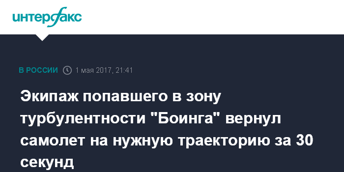 Москва. 1 мая. INTERFAX.RU - Самолет "Аэрофлота" "Боинг 777", следовавший из Москвы в Бангкок и попавший в зону турбулентности, вернулся на нужную траекторию в течение 30 секунд благодаря грамотным действиям экипажа, сообщил командир воздушного судна Александр Рузов.