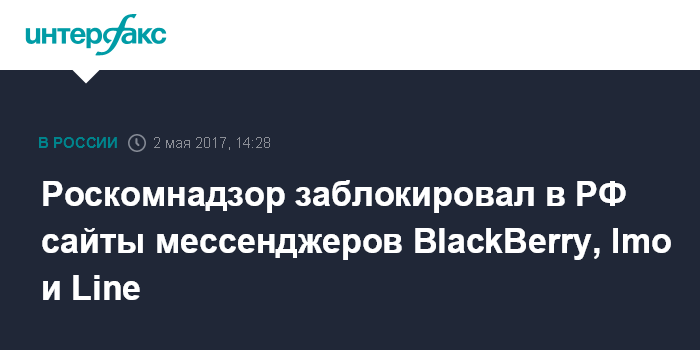 Москва. 2 мая. INTERFAX.RU - Роскомнадзор внес в реестр запрещенных сайтов мессенджеры BlackBerry, Line, Imo.im и аудиовизуальный чат Vchat, сообщает Роскомсвобода.