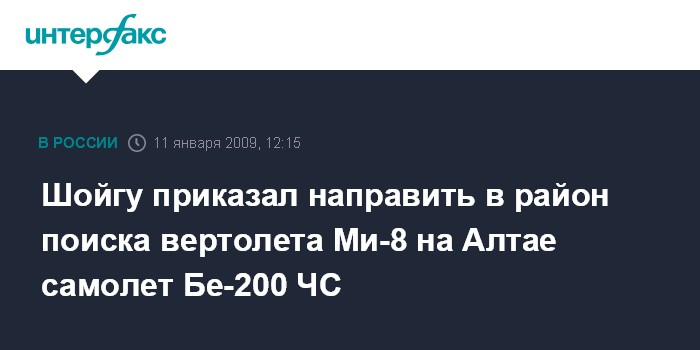 Москва. 11 января. INTERFAX.RU - Глава МЧС России Сергей Шойгу принял решение направить в район поиска вертолета Ми-8 на Алтае самолет Бе-200 ЧС.