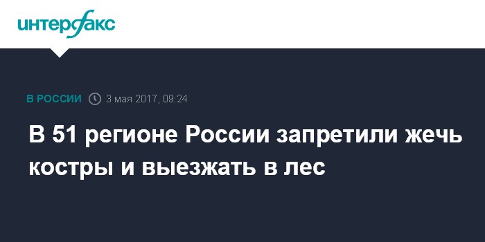 Москва. 3 мая. INTERFAX.RU - Особый противопожарный режим, устанавливающий запрет на разведение костров, сжигание травы, мусора, порубочных остатков, а также на выезд в леса населения, введен в 51 регионе России, сообщили в пресс-службе МЧС России.