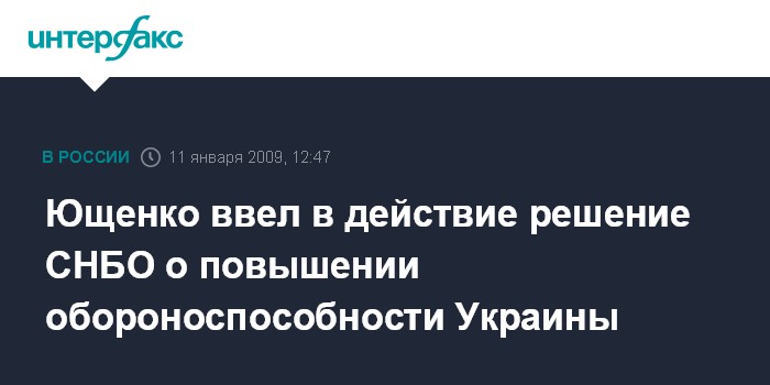 Москва. 11 января. INTERFAX.RU - Президент Украины Виктор Ющенко ввел в действие решение Совета национальной безопасности и обороны о неотложных мерах по повышению обороноспособности государства.