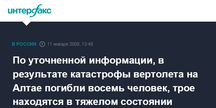 По уточненной информации, в результате катастрофы вертолета на Алтае погибли восемь человек, трое находятся в тяжелом состоянии