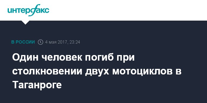 Москва. 4 мая. INTERFAX.RU - Мотоциклист погиб в результате столкновения с автомобилем в Таганроге, еще один водитель мотоцикла госпитализирован, сообщили "Интерфаксу" в ГУ МВД России по Ростовской области.