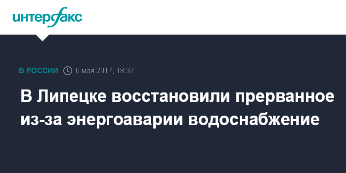 Москва. 6 мая. INTERFAX.RU - В Липецке восстановлено водоснабжение микрорайона, оставшегося без воды из-за энергоаварии, сообщается на сайте Главного управления МЧС России по Липецкой области.