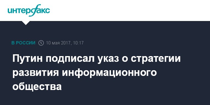 Москва. 10 мая. INTERFAX.RU - Президент Владимир Путин подписал указ "О стратегии развития информационного общества в РФ на 2017 - 2030 годы".