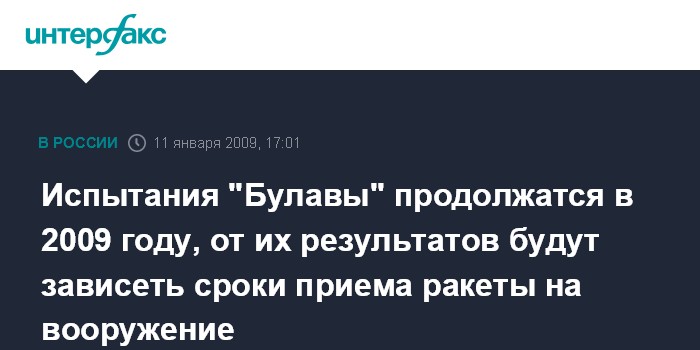 В течение 2009 г., как сообщалось, планируется выполнить четыре испытательных пуска "Булавы". Всего с 2003 года было проведено 10 пусков "Булавы", из которых пять неудачных.
