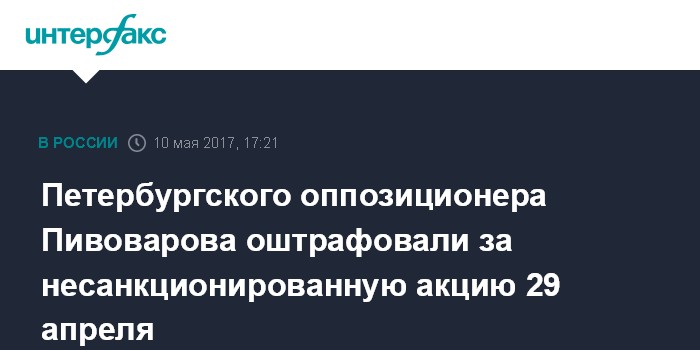 Москва. 10 мая. INTERFAX.RU - Петроградский суд Санкт-Петербурга оштрафовал координатора движения "Открытая Россия" Андрея Пивоварова за организацию несанкционированной акции протеста 29 апреля, сообщил оппозиционер в фейсбуке в среду.