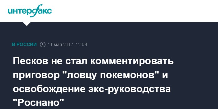 Москва. 11 мая. INTERFAX.RU - В Кремле не комментируют судебные приговор осужденному условно екатеринбургскому "ловцу покемонов" в храме блогеру Руслану Соколовскому и выход на свободу экс-руководителей "Роснано" Леонида Меламеда и Святослава Понурова, заявил пресс-секретарь президента РФ Дмитрий Песков.