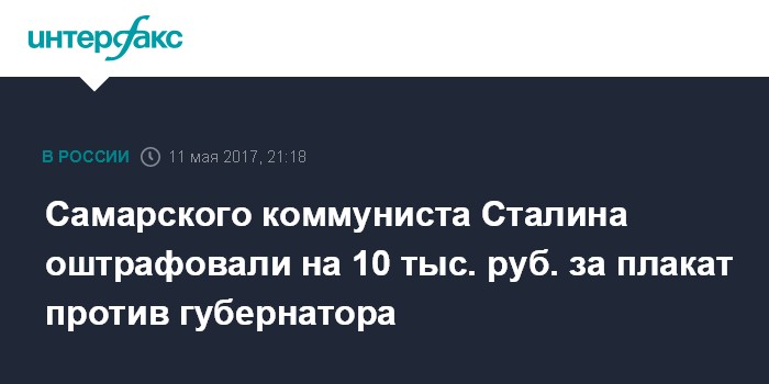 Москва. 11 мая. INTERFAX.RU - Ленинский районный суд Самары в четверг оштрафовал первого секретаря самарского горкома КПРФ Дамира Сталина за демонстрацию на первомайском шествии плаката с требованием отставки губернатора.