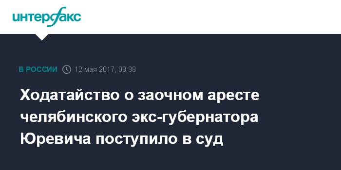 Москва. 12 мая. INTERFAX.RU - Ходатайство следствия о заочном аресте бывшего губернатора Челябинской области Михаила Юревича в пятницу поступило в Ленинский суд Екатеринбурга, сообщил "Интерфаксу" его адвокат Игорь Трунов.