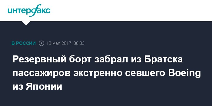 Москва. 13 мая. INTERFAX.RU - Резервный борт японской авиакомпании ANA прибыл утром в субботу в аэропорт города Братск Иркутской области за пассажирами дальнемагистрального Боинга-787, который в пятницу, следуя из Токио в Дюссельдорф, экстренно приземлился из-за отказа двигателя.