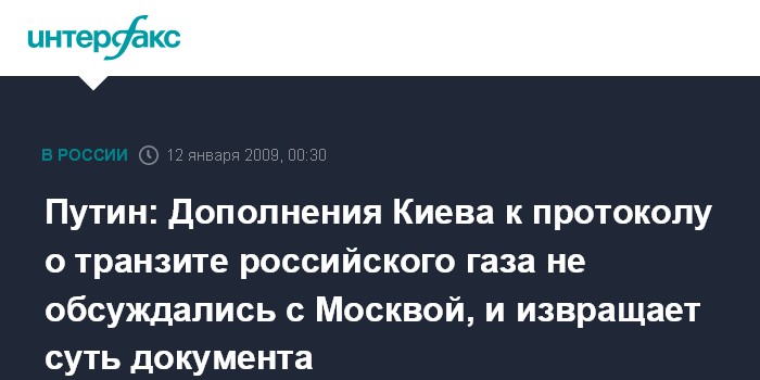 Москва. 12 Января. ИНТЕРФАКС - Председатель правительства РФ Владимир Путин считает, что украинские дополнения к протоколу о транзите российского газа с российской стороной не обсуждались, и извращает суть документа.