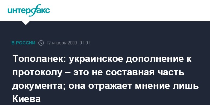 Москва. 12 января. ИНТЕРФАКС - Глава правительства Чехии Мирек Тополанек считает, что украинское дополнение к "Протоколу" не является составной частью документа и отражает только мнение Киева.
