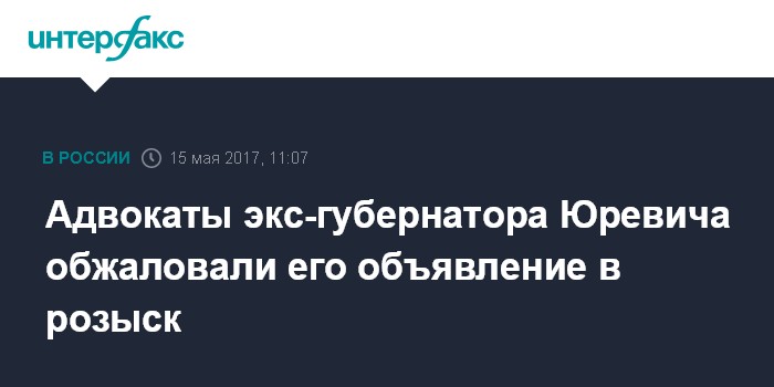 Москва. 15 мая. INTERFAX.RU - Защита бывшего губернатора Челябинской области Михаила Юревича, обвиняемого во взяточничестве и подстрекательстве к клевете, подала жалобу в Ленинский районный суд Екатеринбурга на объявление его в федеральный и международный розыск.