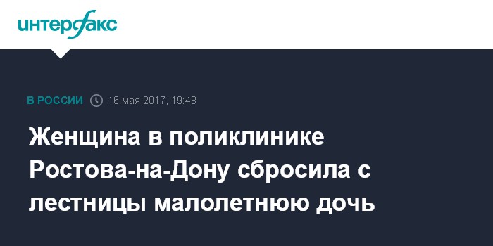 Москва. 16 мая. INTERFAX.RU - В Ростове-на-Дону возбудили уголовное дело в отношении матери, которая, по предварительным данным, сбросила с лестничного пролета свою малолетнюю дочь, сообщили агентству "Интерфакс" в пресс-службе следственного управления СК РФ по Ростовской области.