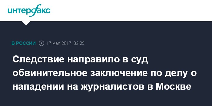Москва. 16 мая. INTERFAX.RU - Следователи в Москве направили в суд обвинительное заключение по делу нападения пятерых мужчин на журналистов сетевого издания в ноябре прошлого года, сообщило ГСУ СКР по Москве.