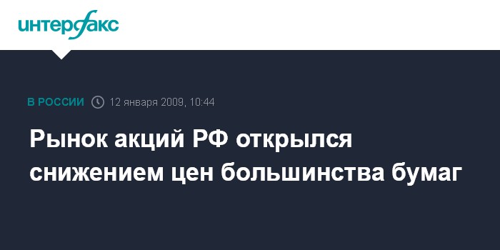 Москва. 12 января. INTERFAX.RU - Рынок акций РФ открылся в понедельник снижением цен большинства бумаг следом за мировыми фондовыми площадками и нефтью, индекс ММВБ за минуту торгов просел на 0,3%.
