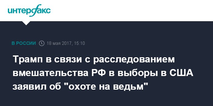 Москва. 18 мая. INTERFAX.RU - Президент США Дональд Трамп назвал назначение спецпрокурора для расследования предполагаемого вмешательства РФ в американские выборы проявлением "охоты на ведьм".